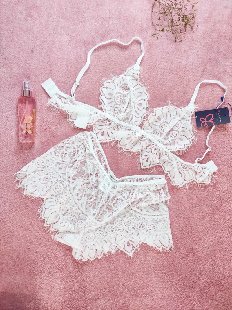 BabyDoll todo em renda, composto por short curto em renda, sem forro, e top em renda, sem aro e alça reguláveis, fecho atrás de dois ganchos.