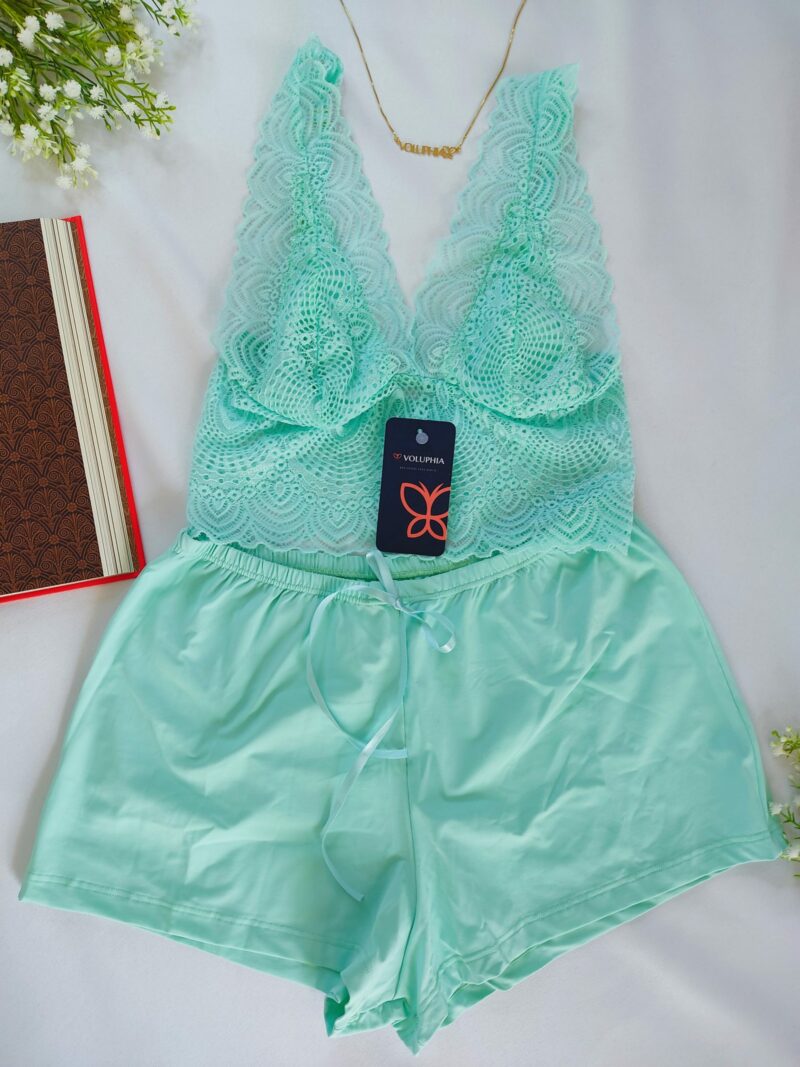 BabyDoll, Blusa toda em renda que pode ser usado como crepped, ela é forrada no seio com alças reguláveis, short em malha fria.
