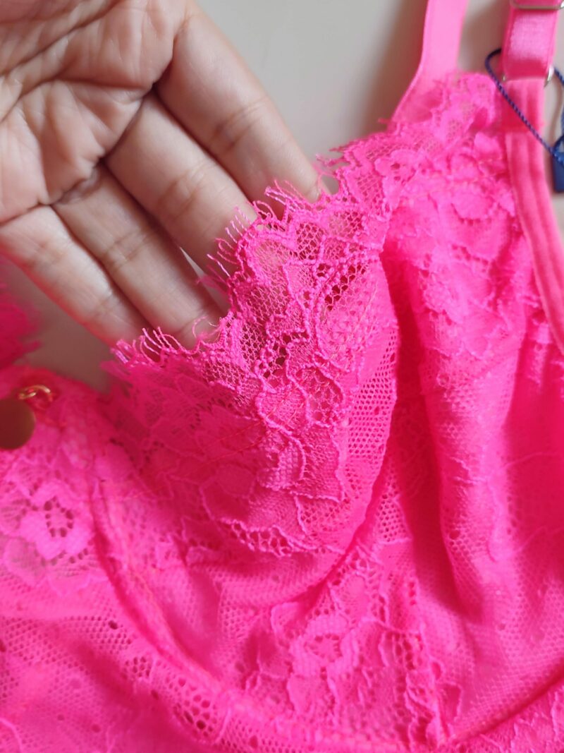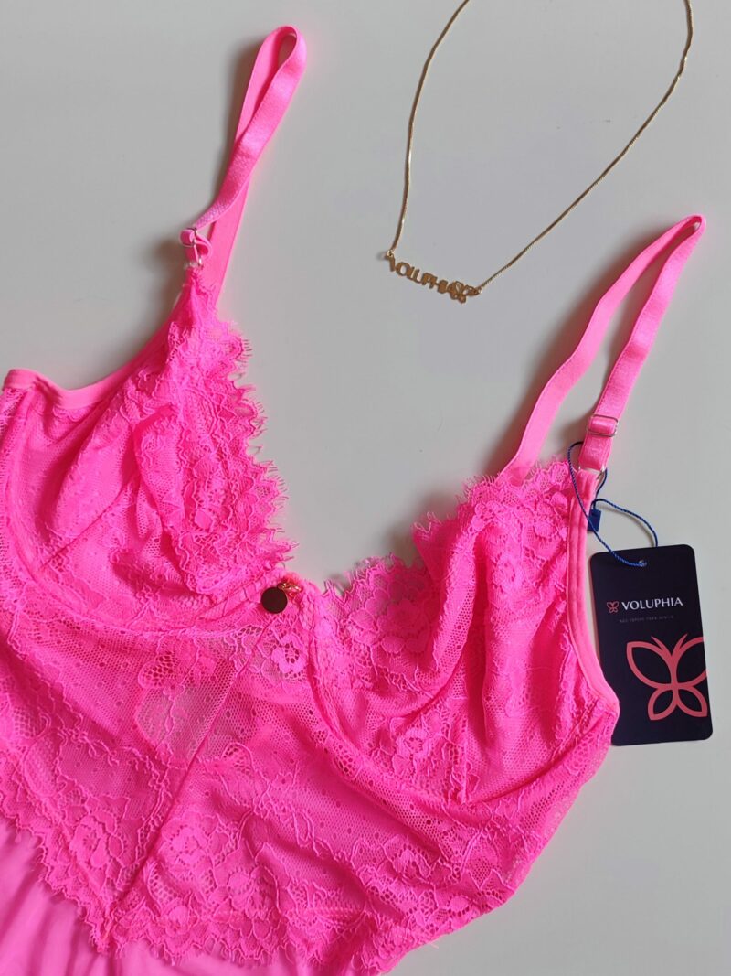 Body de Tule com Renda Chantilly, com forro no seio, sem bojo, com aro, fecho embaixo e alças reguláveis.