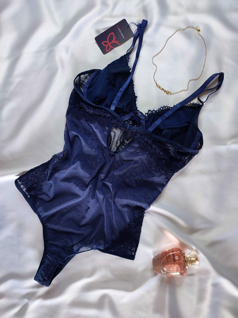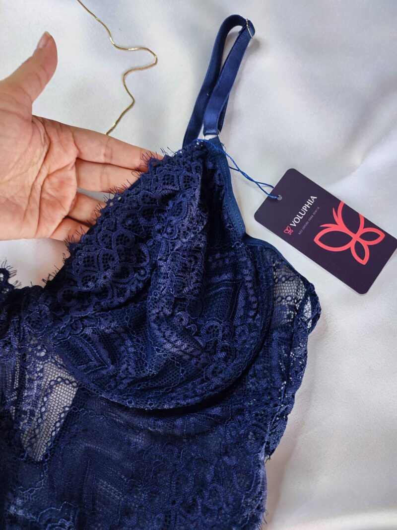 Body de Tule com Renda Chamtilly, com forro no seio, sem bojo, com aro, fecho embaixo e alças reguláveis.