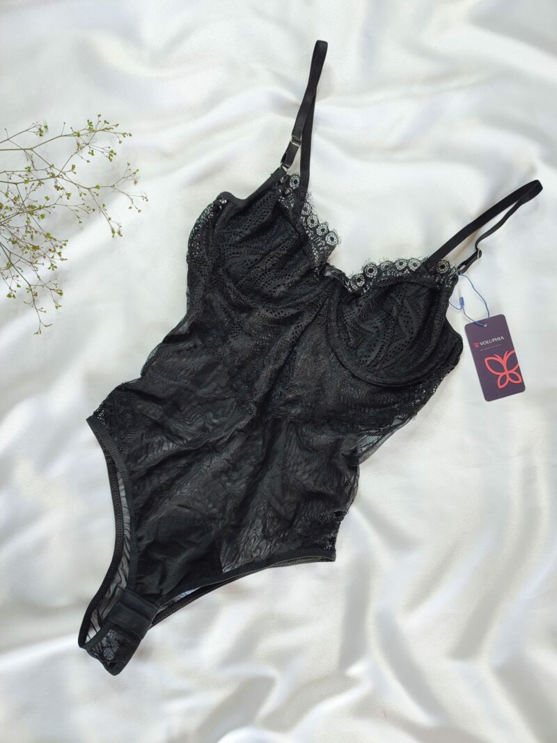 Body de Tule com Renda Chamtilly, com forro no seio, sem bojo, com aro, fecho embaixo e alças reguláveis.