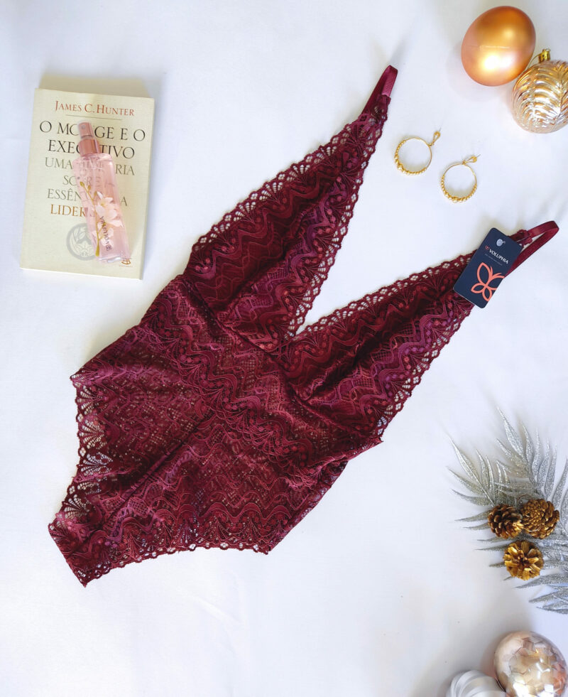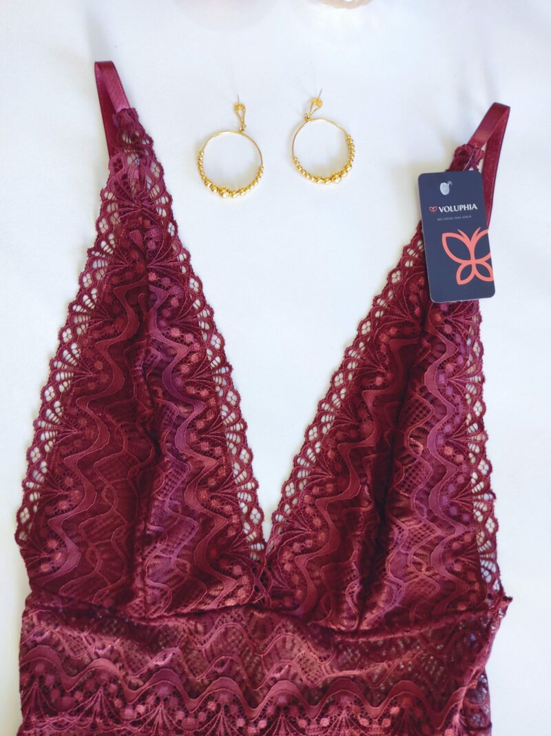 Body todo em renda, decotado, com forro, sem fecho embaixo e com alças reguláveis.