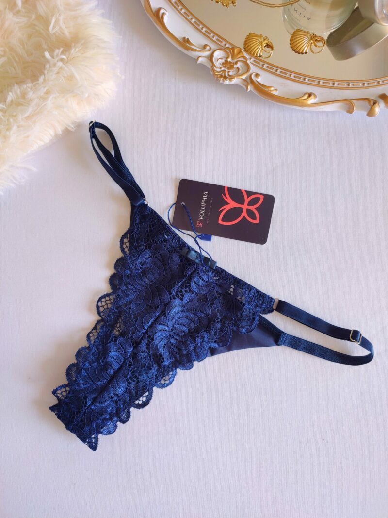 Calcinha em renda na frente e fio duplo atras, laterais com regulagem.