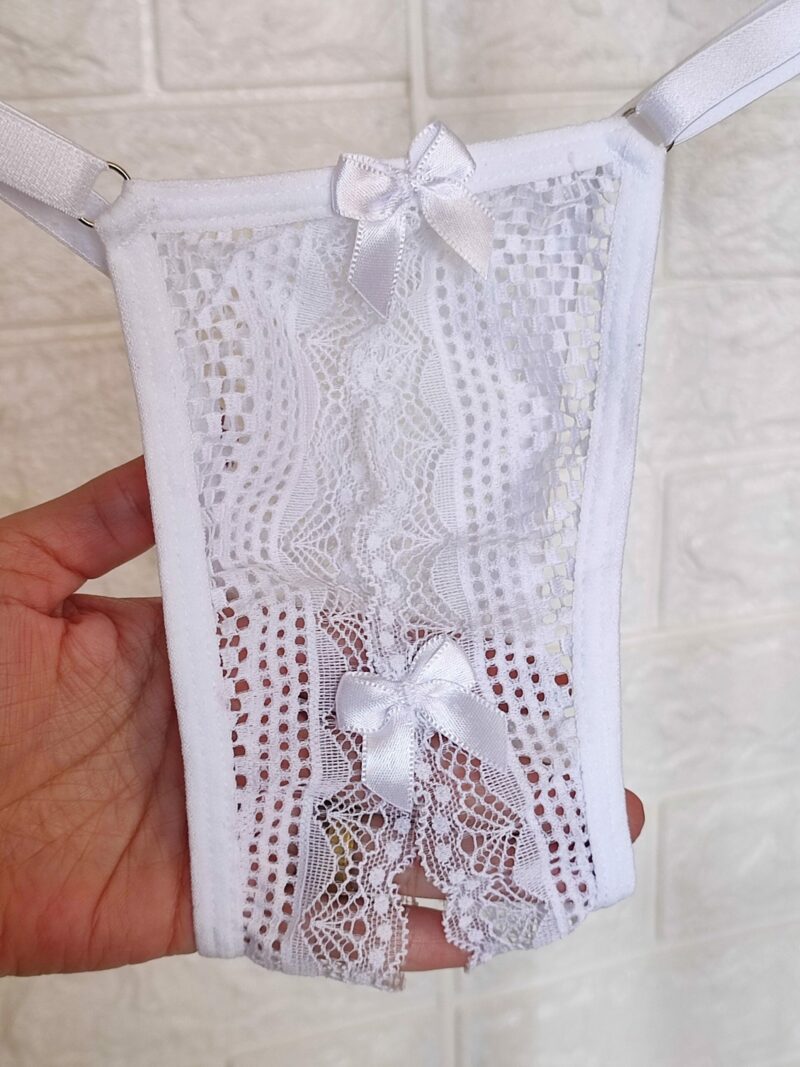 Calcinha Thais, em renda, com lacinhos, laterais com regulagem conforme foto, aberta embaixo (não acompanha sutiã).