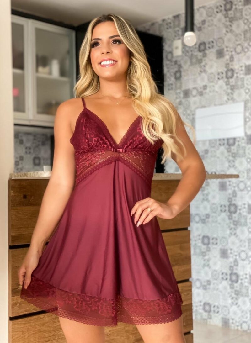 Camisola Amarillys, com renda abaixo do busto que vai até as costas e na barra, alças reguláveis, acompanha calcinha com regulagem.