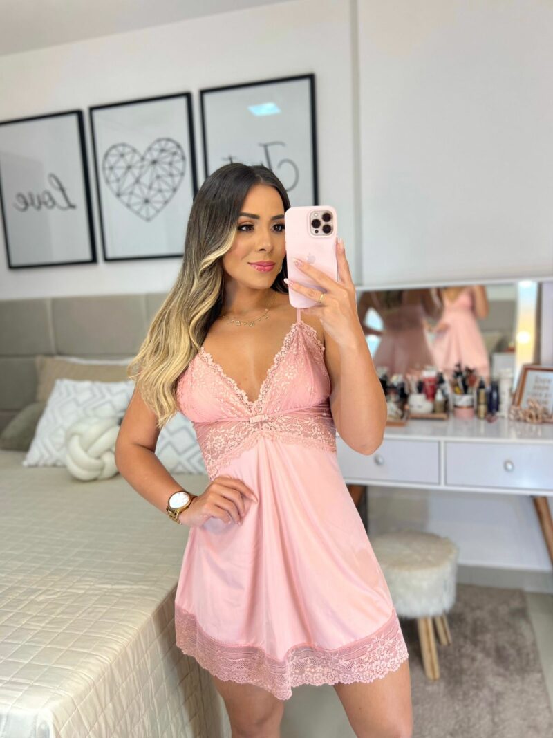 Camisola em malha fria, com alças reguláveis, detalhes em renda, forrada no seio, acompanha calcinha.