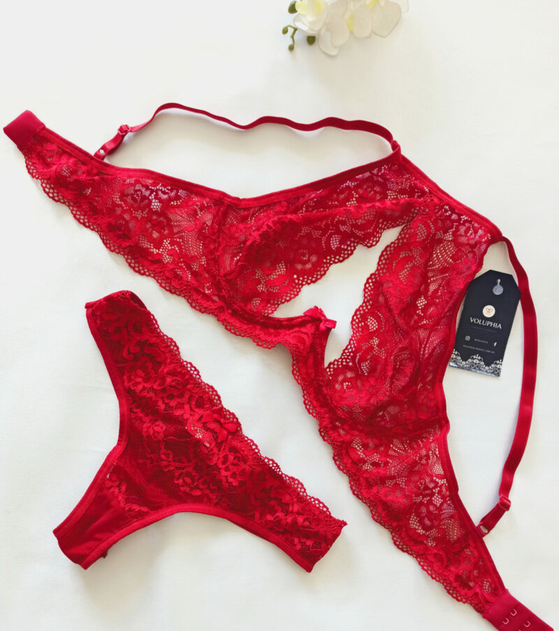 Conjunto com sutiã decotado, sem bojo, com aro, calcinha em renda e fio duplo de tule. Fica lindo, garanto que vai amar!