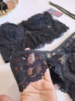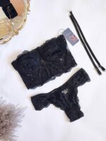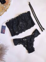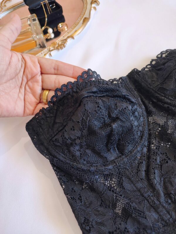 Sutiã em renda com aro, estilo cropped, tomara que caia, acompanha alças reguláveis, com forro e não possui fecho atrás.
