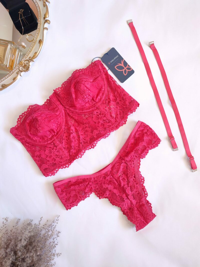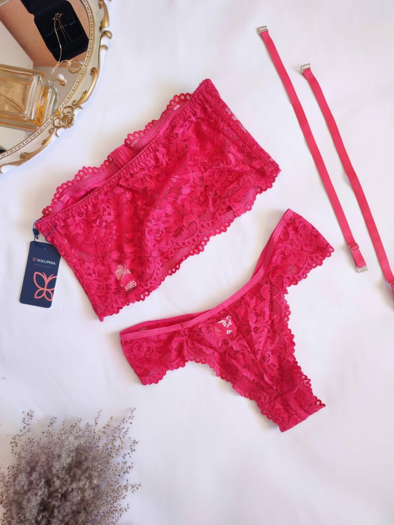Sutiã em renda com aro, estilo cropped, tomara que caia, acompanha alças reguláveis, com forro e não possui fecho atrás.
