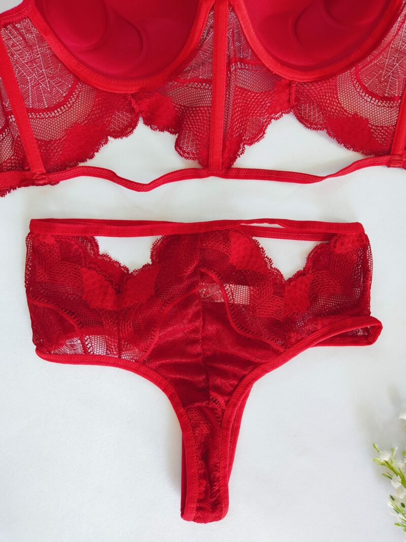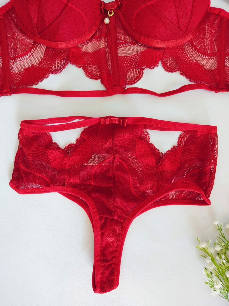 Conjunto com bojo bolha no P e M e bojo casca no tamanho G, podendo ser usado como cropped, detalhes vazado conforme fotos, calcinha cintura alta, semi fio.