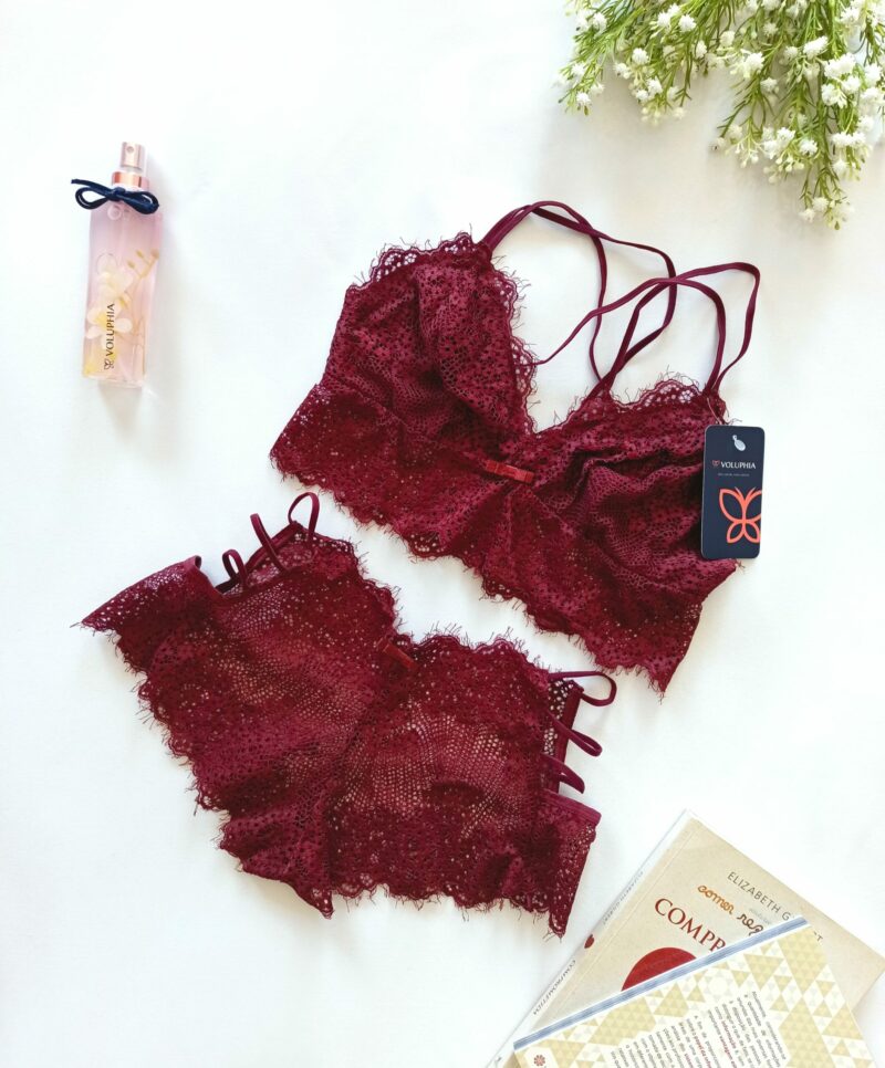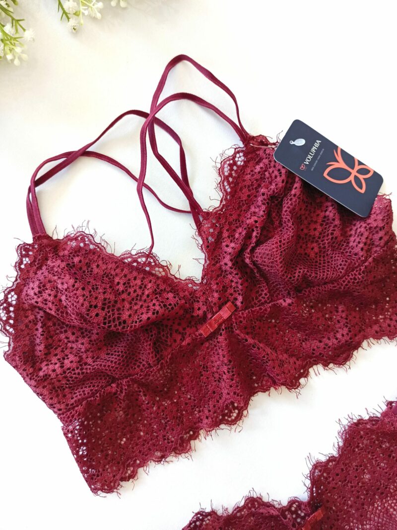 Conjunto, sem bojo, sem aro, com forro, todo em renda, calcinha caleçon em renda com detalhes na lateral.
