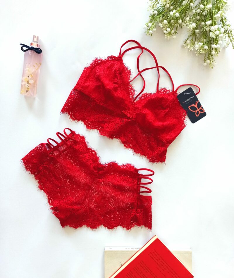 Conjunto, sem bojo, sem aro, com forro, todo em renda, calcinha caleçon em renda com detalhes na lateral.