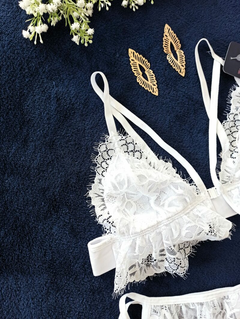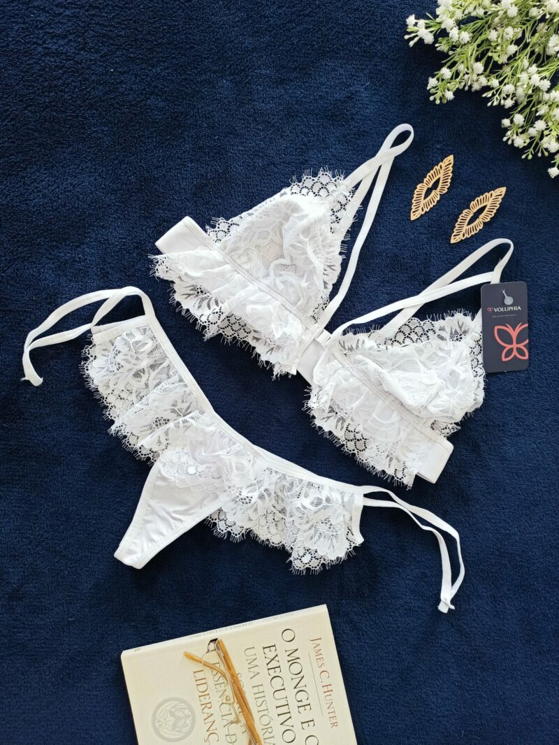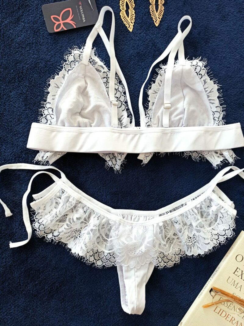Conjunto, Sem Bojo, Sem Aro, Com forro, todo em renda, sutiã com fecho na frente, calcinha com laços na laterais e fio duplo.
