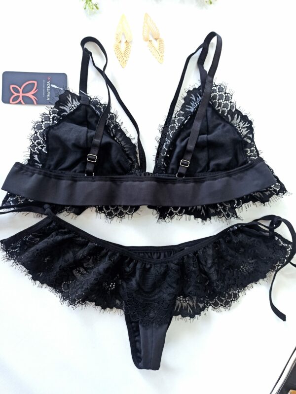 Conjunto, Sem Bojo, Sem Aro, Com forro, todo em renda, sutiã com fecho na frente, calcinha com laços na laterais e fio duplo.