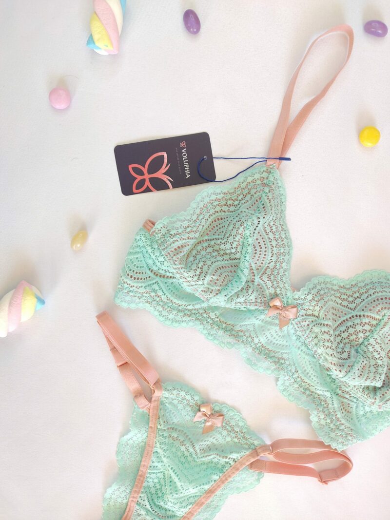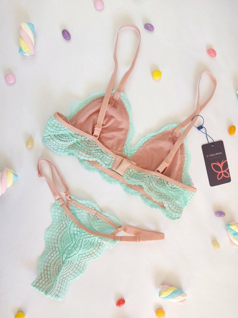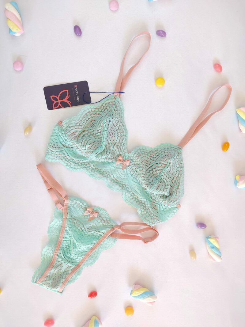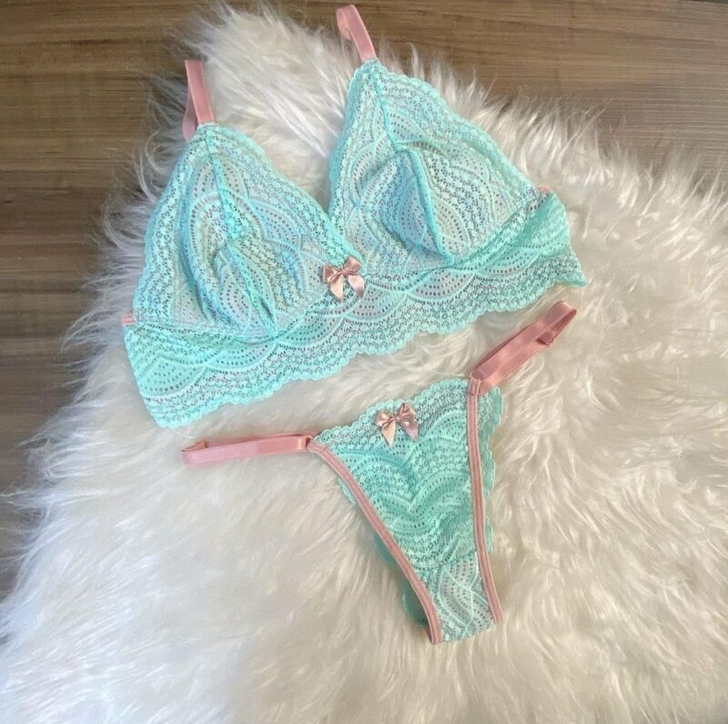 Conjunto, sem bojo, sem forro, sem aro, alças com regulagem e calcinha de renda com regulagem nas laterais.
