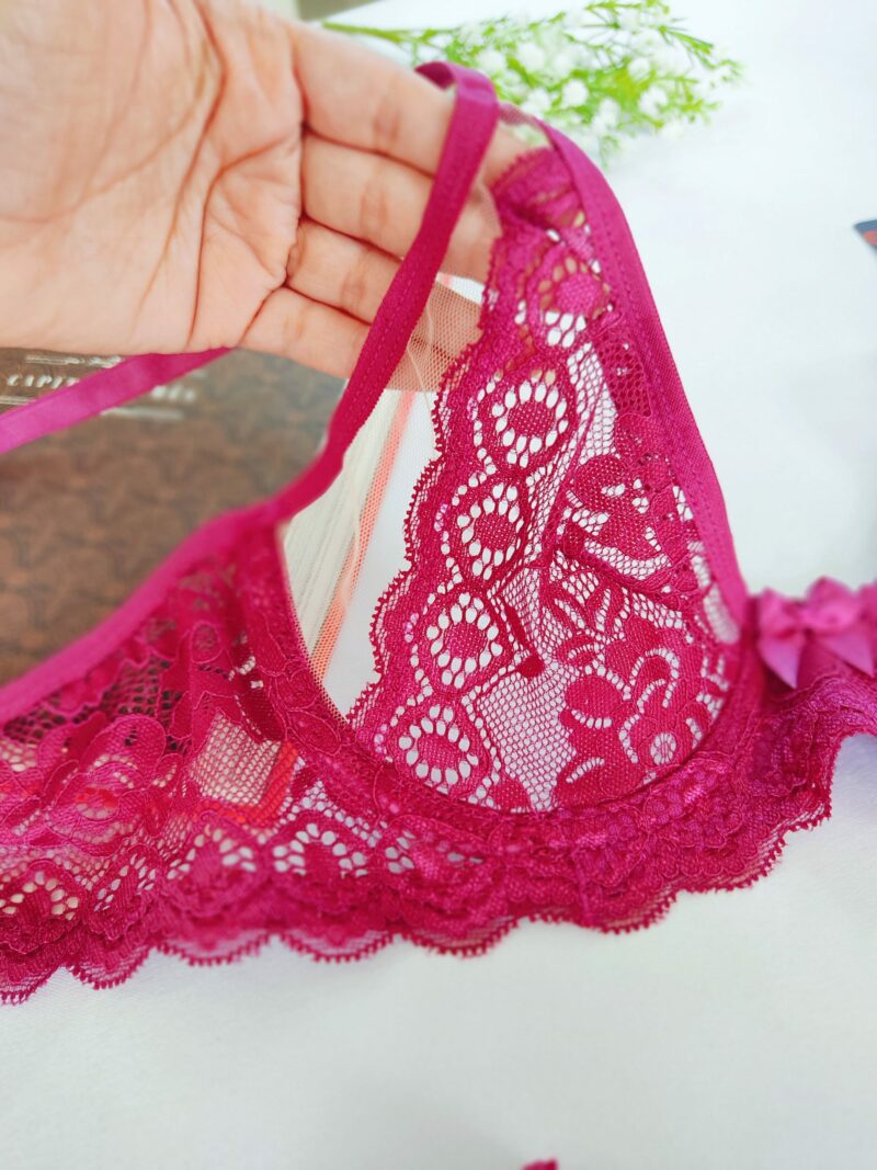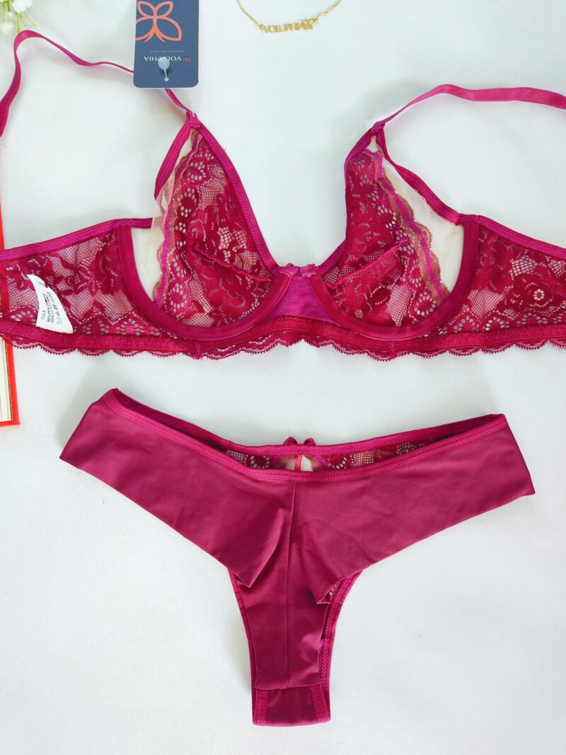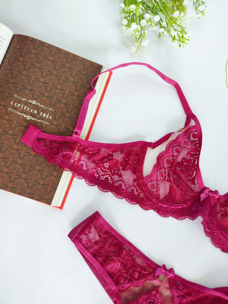 Conjunto em Renda com Tule, Calcinha fio duplo, Alças reguláveis, sem bojo e sem aro.