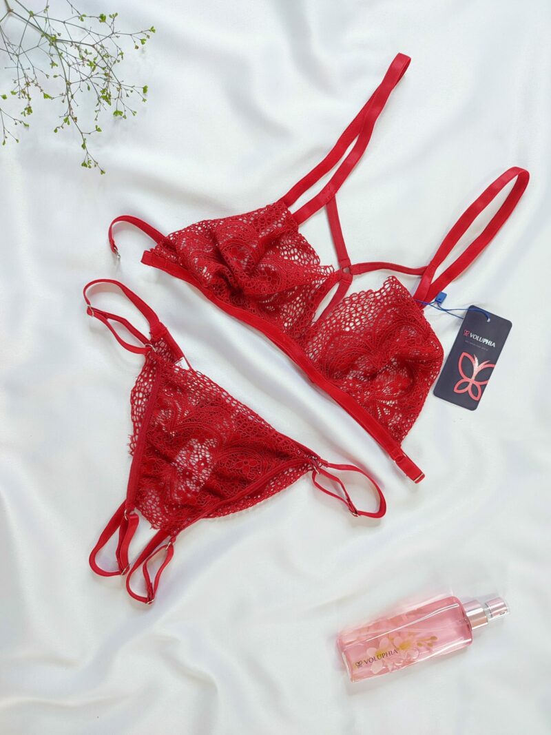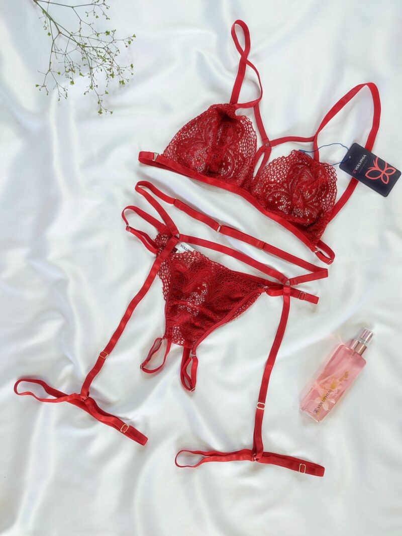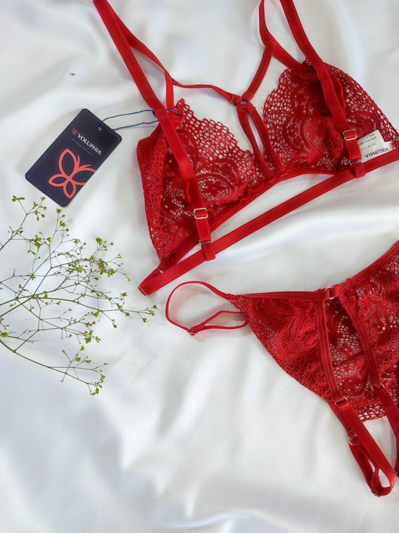 Conjunto, sem bojo, sem forro, sem aro, alças com regulagem e strappy nos seios, calcinha de renda com regulagem nas laterais e embaixo, deixando aberto no bumbum…
