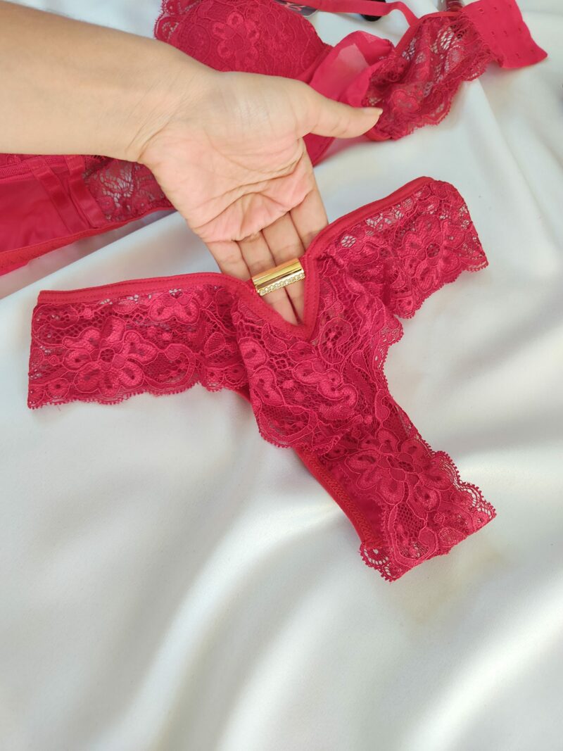 Conjunto Cropped com bojo casca, sem aro, alças reguláveis e fecho com 3 ganchos, calcinha em renda, semi fio com pingente de pedrinha no bumbum (conforme foto).