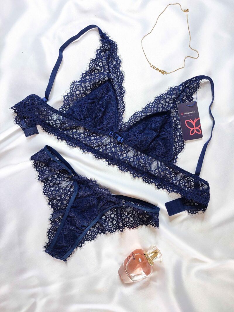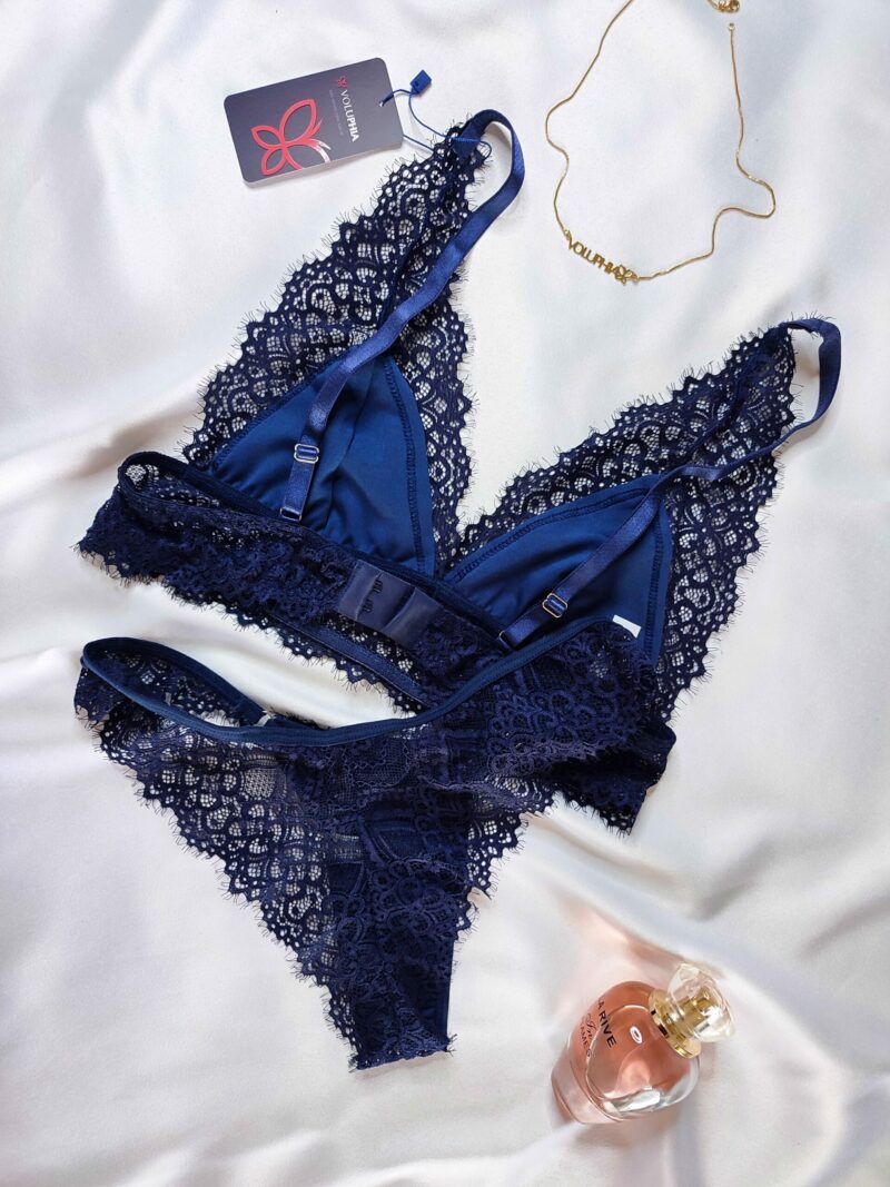Conjunto, sem bojo, com forro, sem aro, alças com regulagem e calcinha de renda.