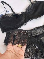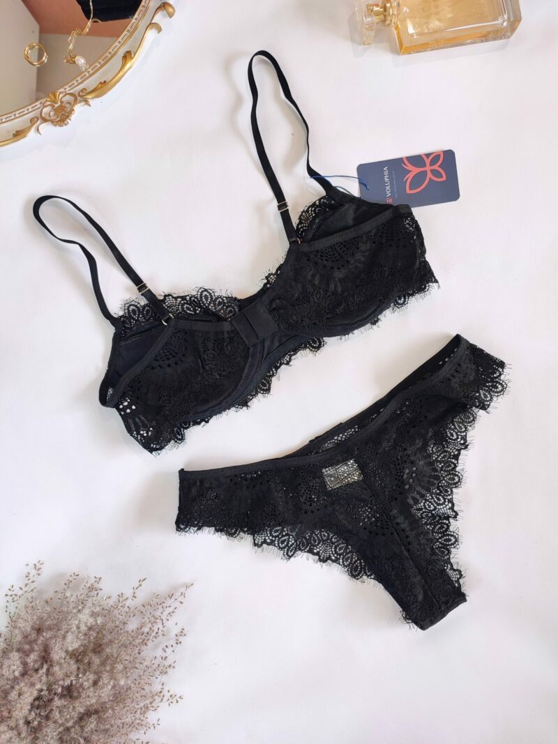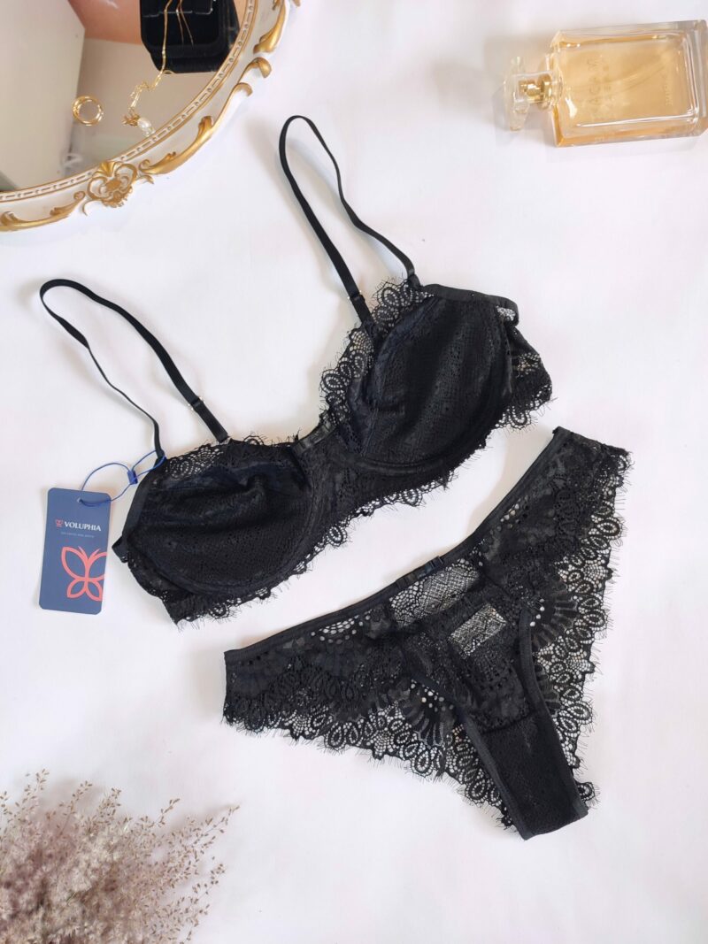 Sutiã em renda com aro, alças reguláveis, com forro e fecho atrás.