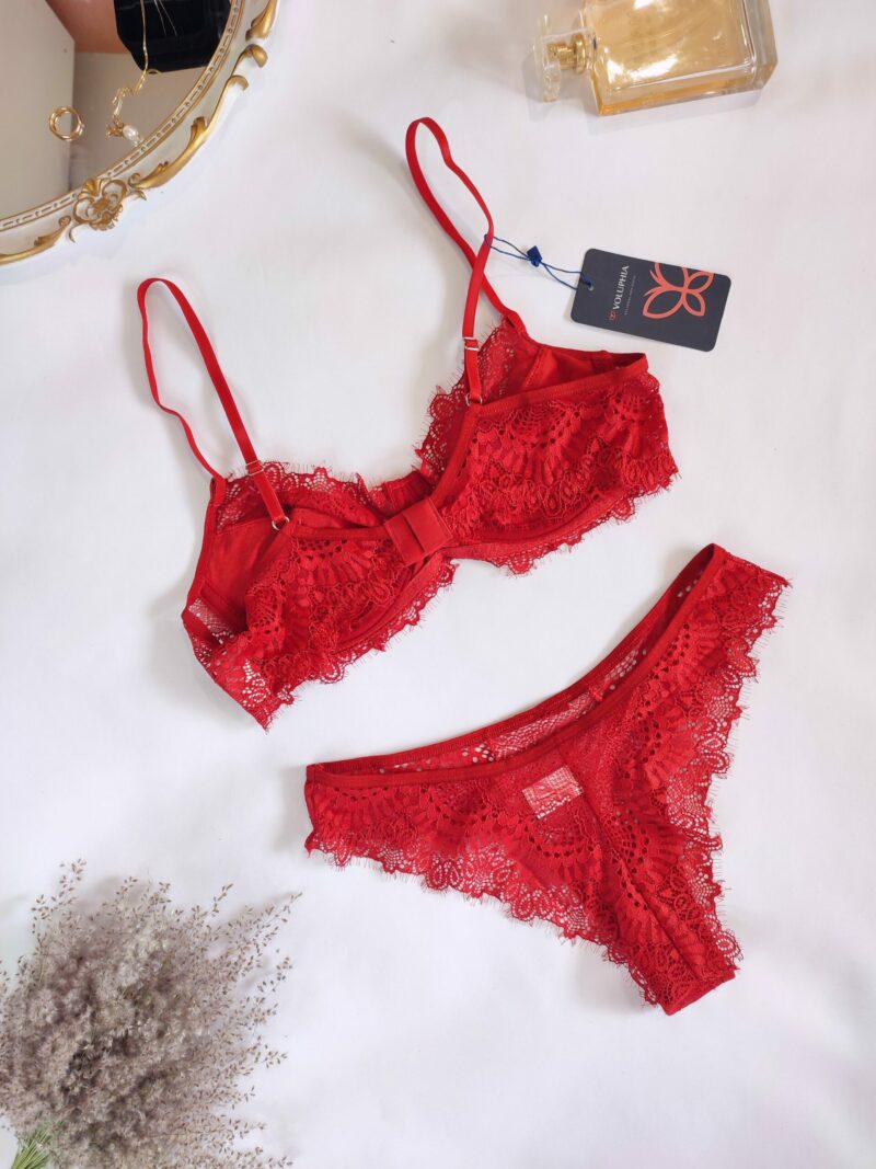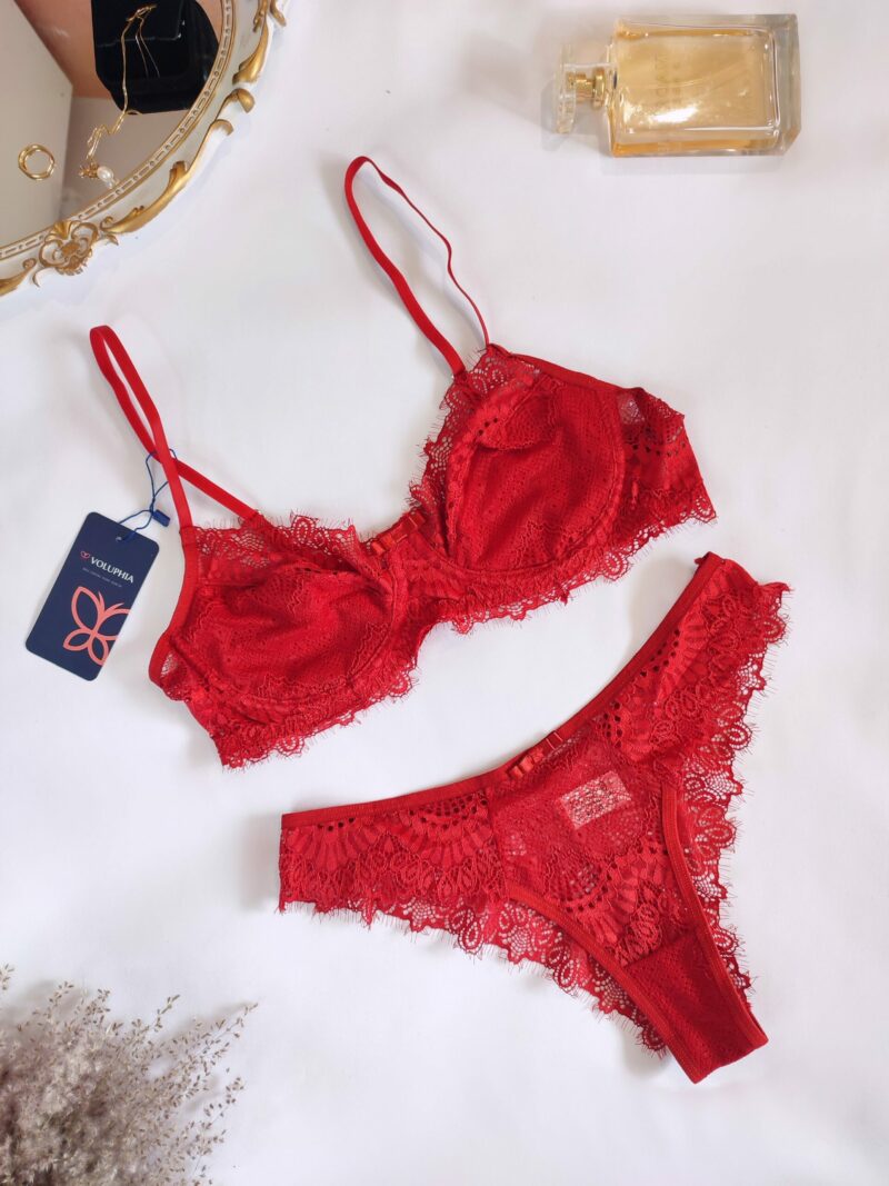 Sutiã em renda com aro, alças reguláveis, com forro e fecho atrás.