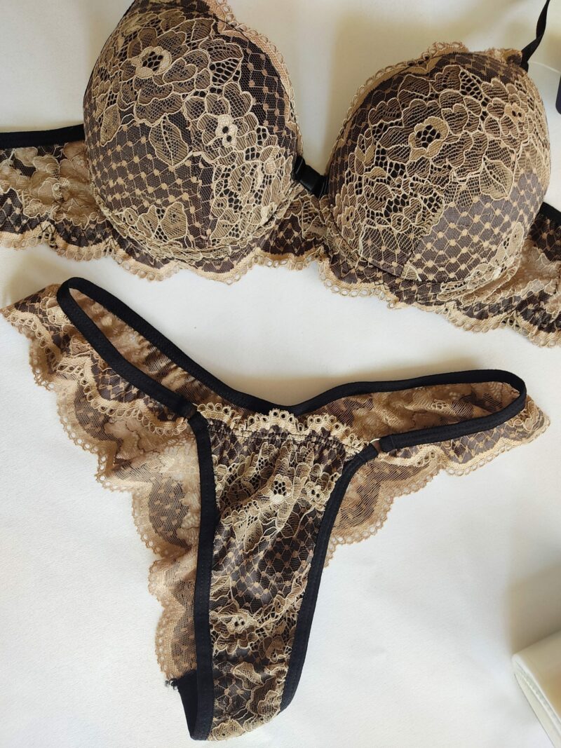 Conjunto, sutiã com bojo, alças com regulagem e calcinha em renda semi fio.
