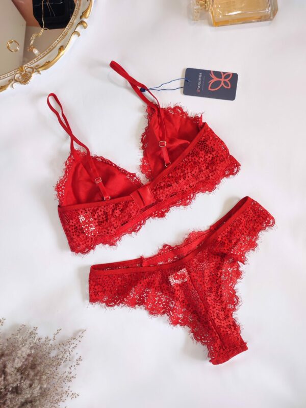 Sutiã em renda sem aro, alças reguláveis, com forro e fecho atrás.