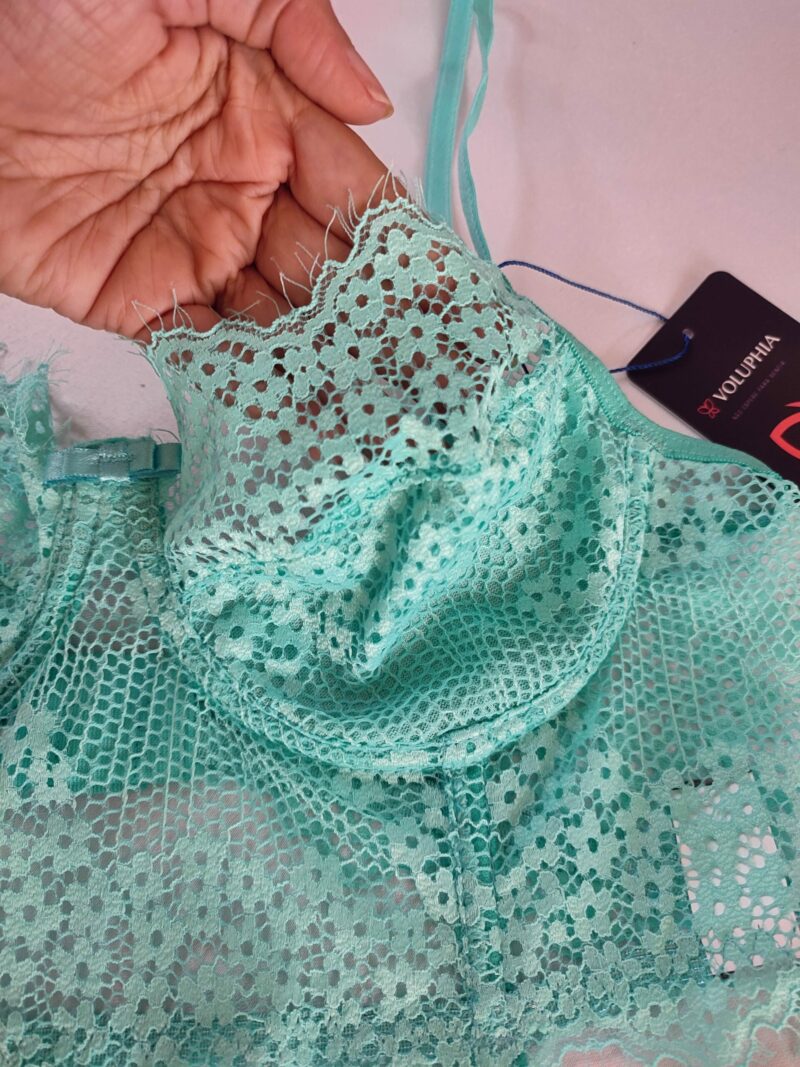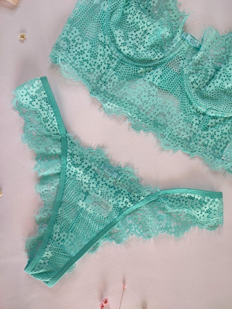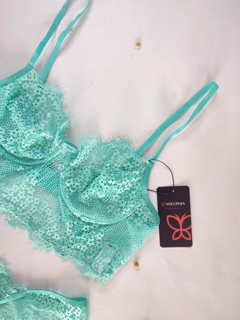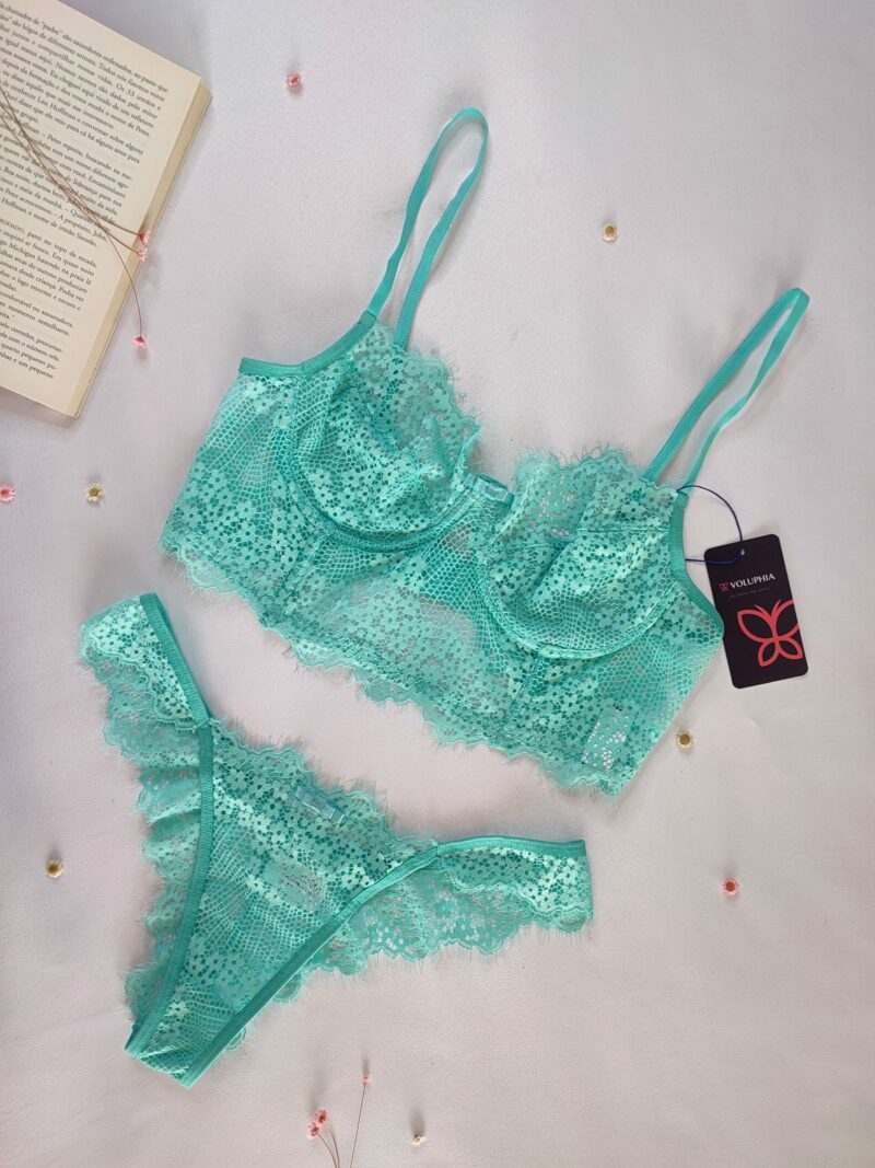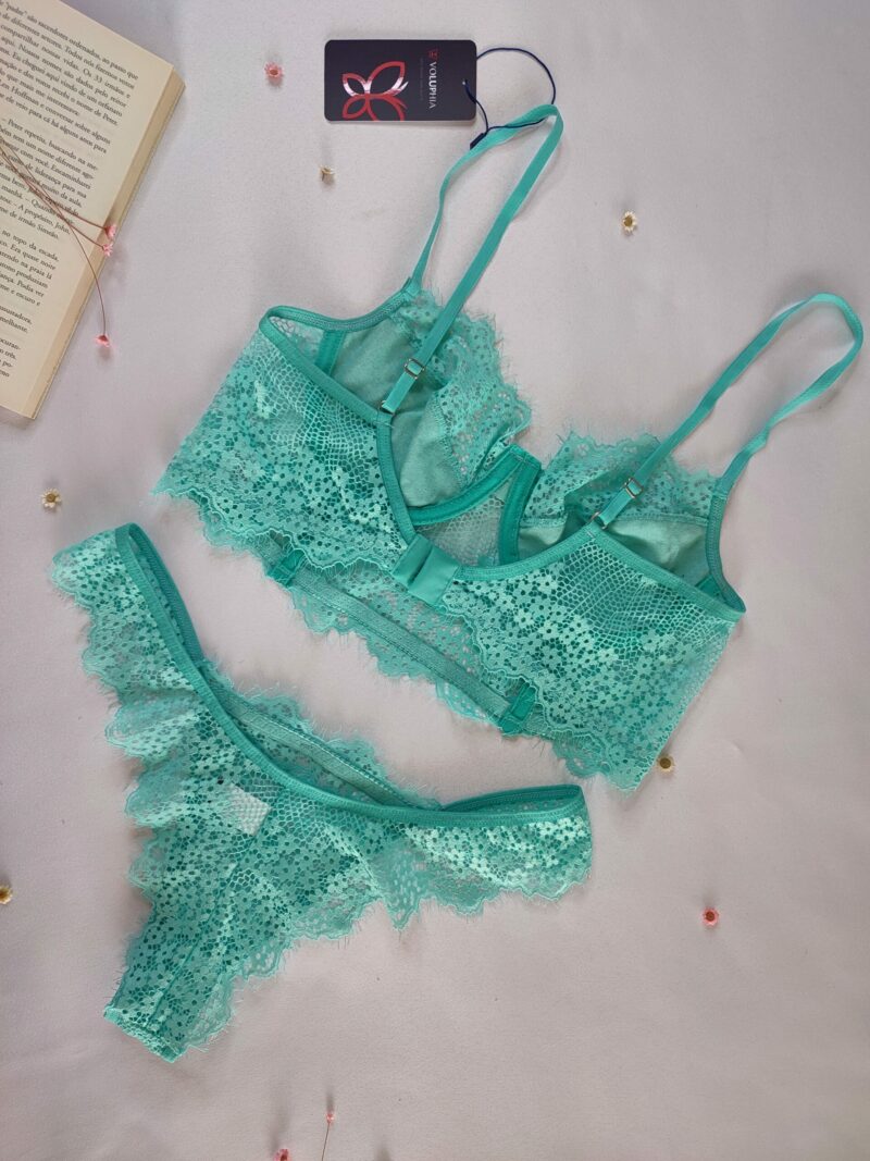 Conjunto com aro, sem bojo, seio com forro, alças reguláveis, fecho atras e calcinha de renda semi fio.