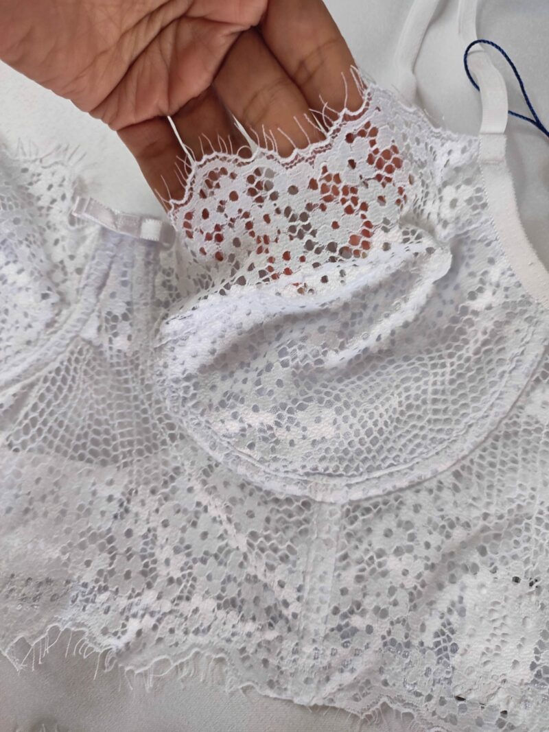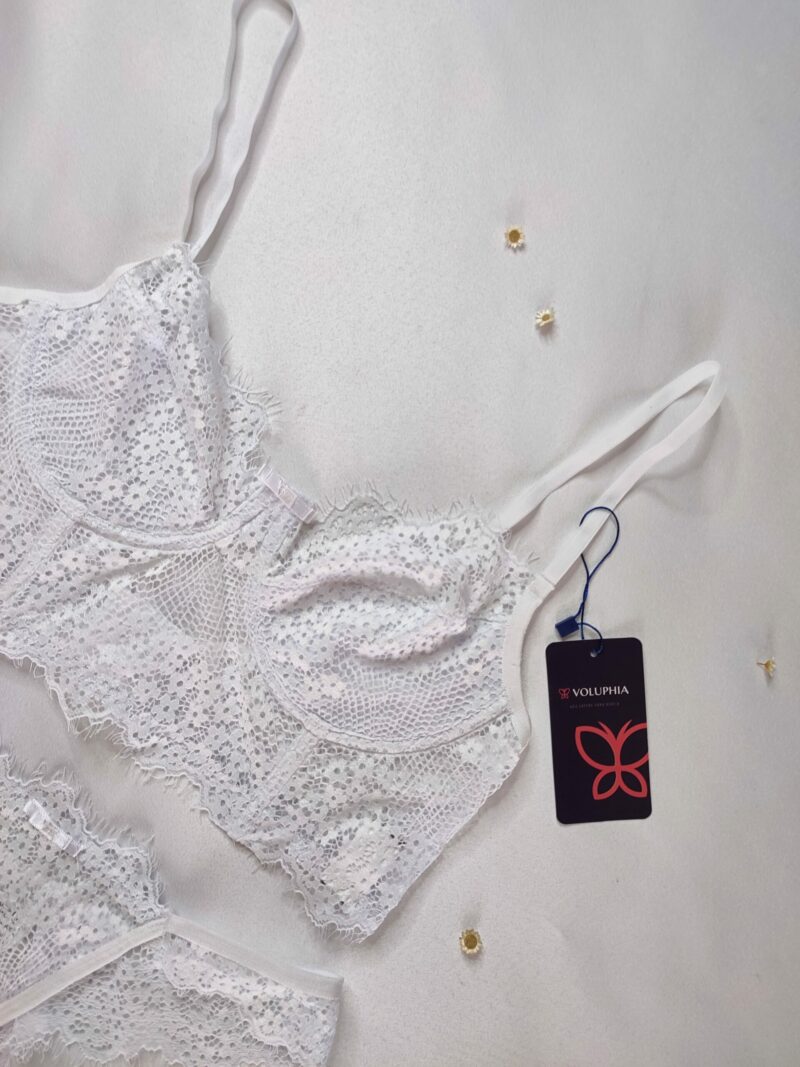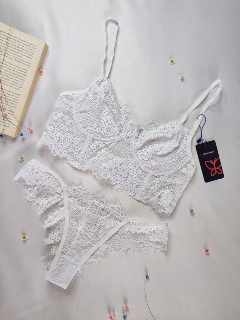 Conjunto com aro, sem bojo, seio com forro, alças reguláveis, fecho atras e calcinha de renda semi fio.