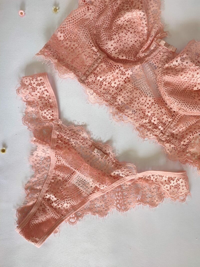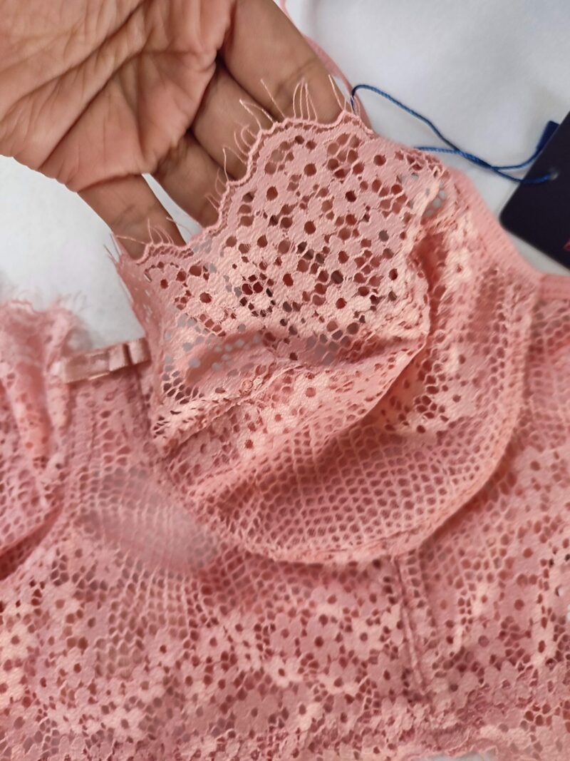Conjunto com aro, sem bojo, seio com forro, alças reguláveis, fecho atras e calcinha de renda semi fio.