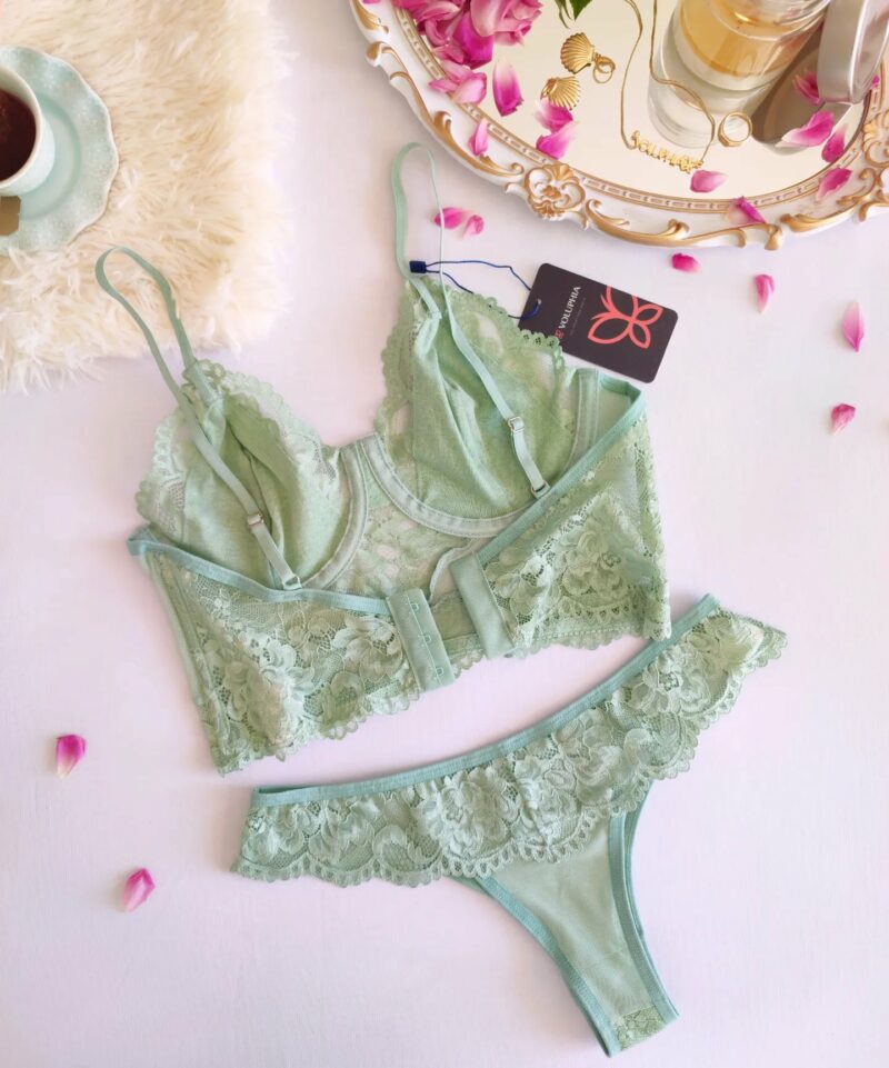 Conjunto em renda e tule, sutiã sem bojo, com aro, forro em tule, alças reguláveis e com fecho atrás.