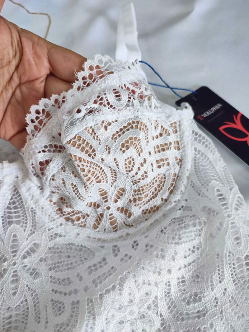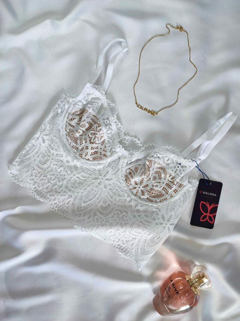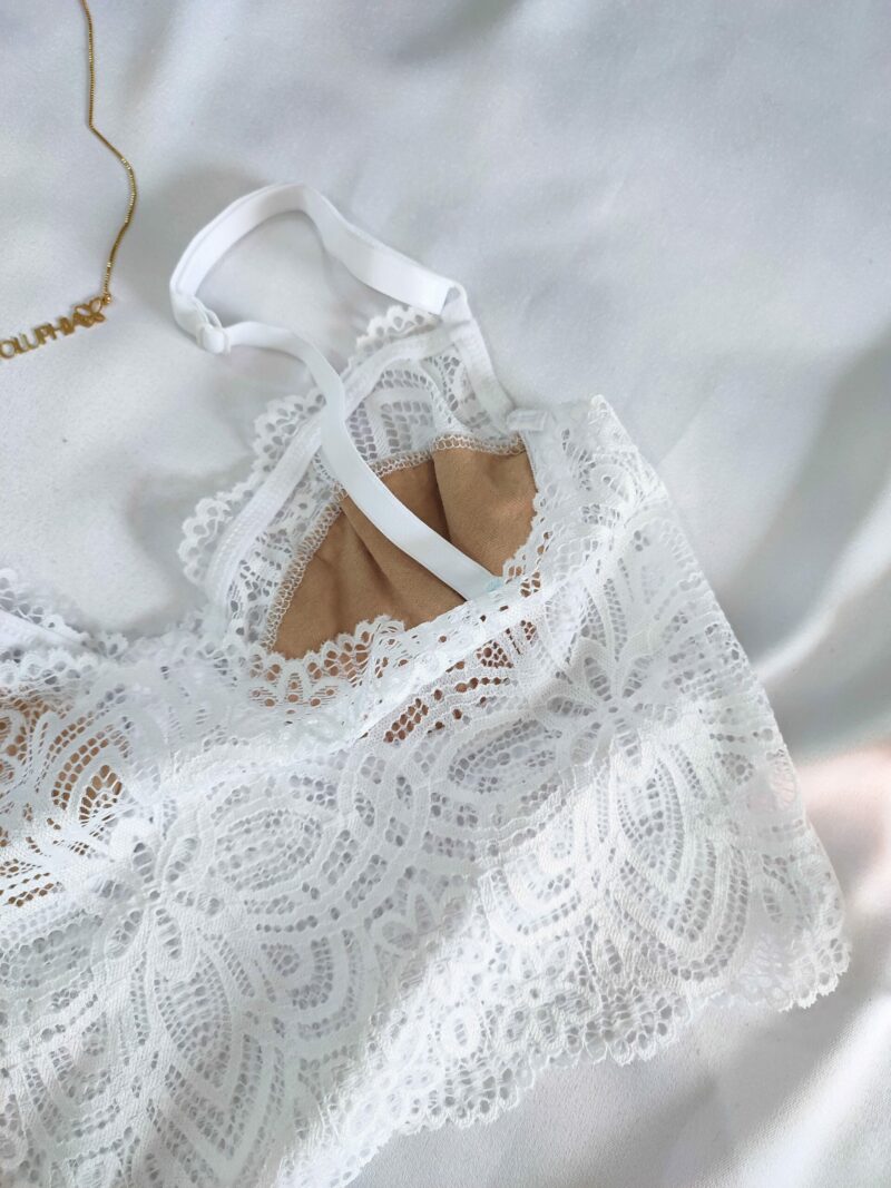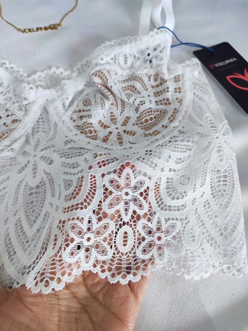 Cropped, sem bojo, com aro, forrado e todo em Renda, alças reguláveis e sem fecho atrás.