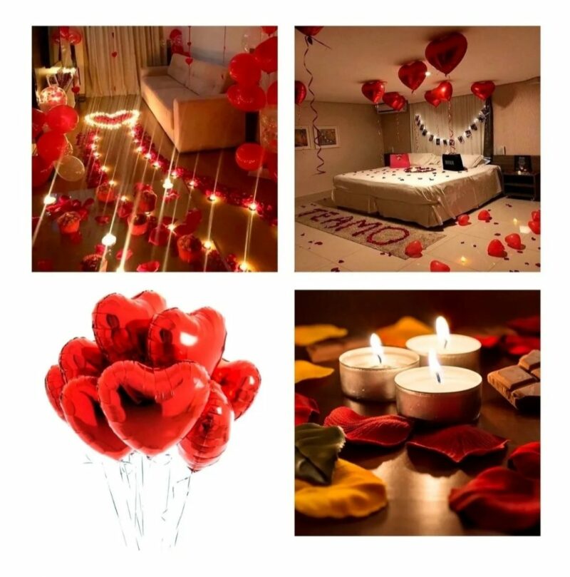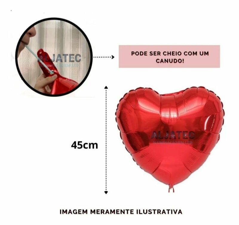 – 3 balões metalizados vermelho em formato de coração com 45cm (vazio).