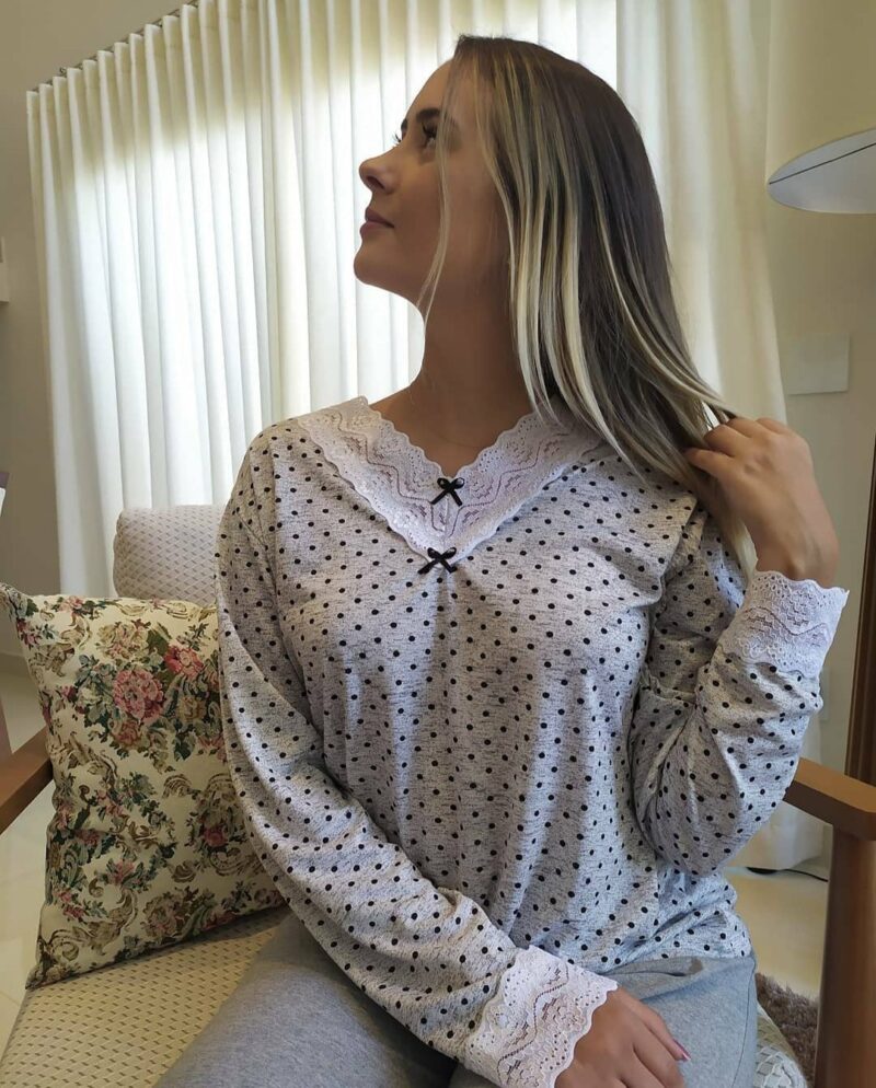 Pijama, blusa de mangas compridas e calça, possui renda a gola, nos pulsos e no tornozelo.