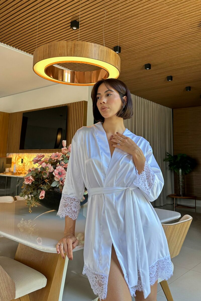 Versátil, o robe em cetim pode ser usado como lingerie de luxo, robe para dormir, robe para noiva, ou como peça especial para se sentir bonita todos os dias.