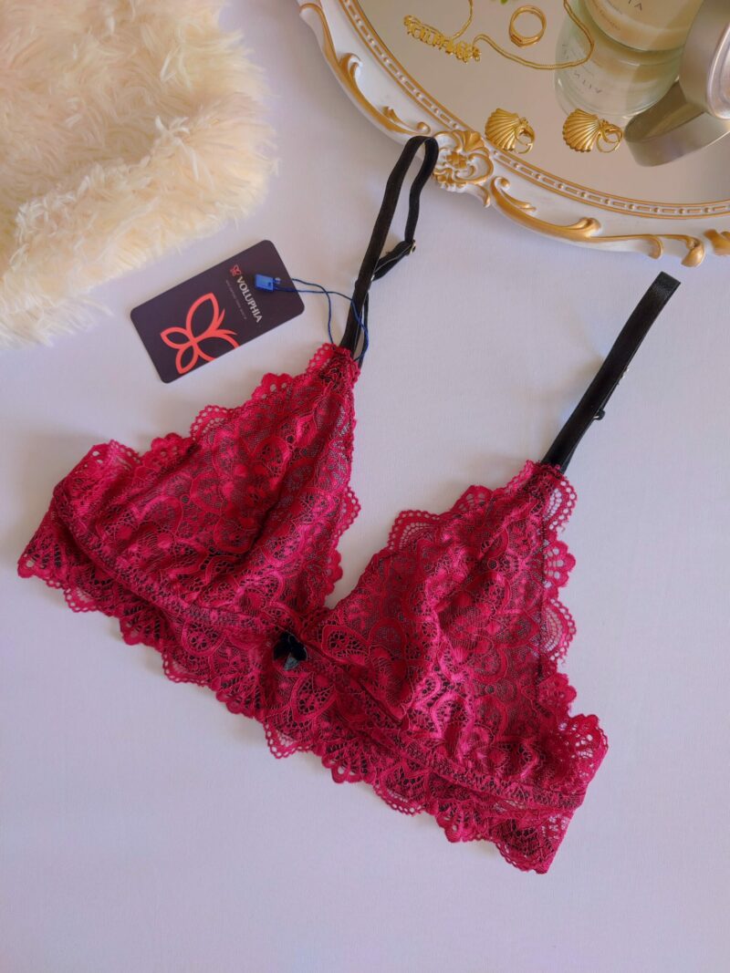 Sutiã, sem bojo, sem aro, forro em tule e todo em Renda, alças reguláveis e com fecho atrás.