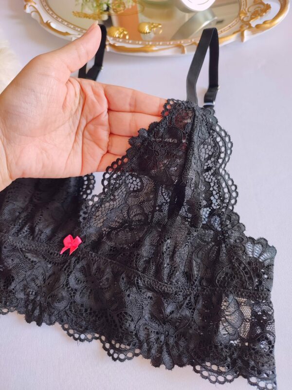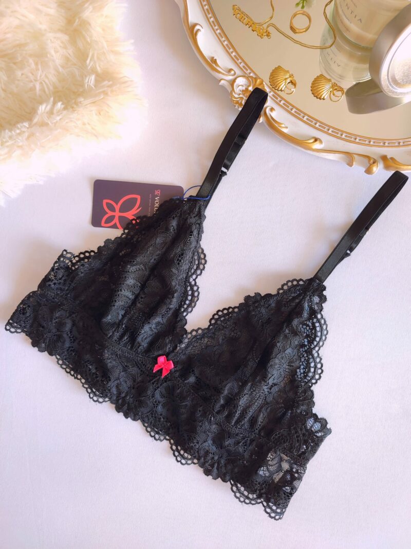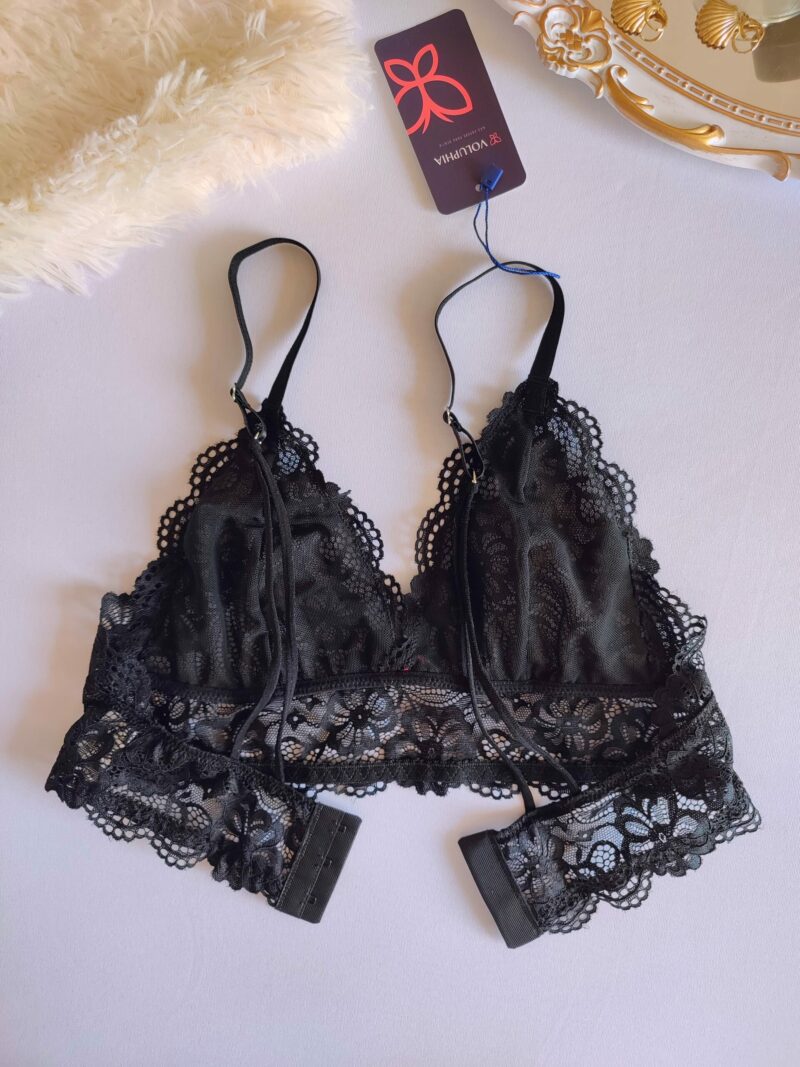 Sutiã, sem bojo, sem aro, forro em tule e todo em Renda, alças reguláveis e com fecho atrás.