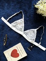 Top branco, em tule, aplicação de rosa, com fecho e alças reguláveis.