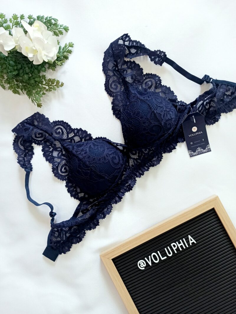 Top azul marinho, com bojo, em renda, com alças reguláveis.