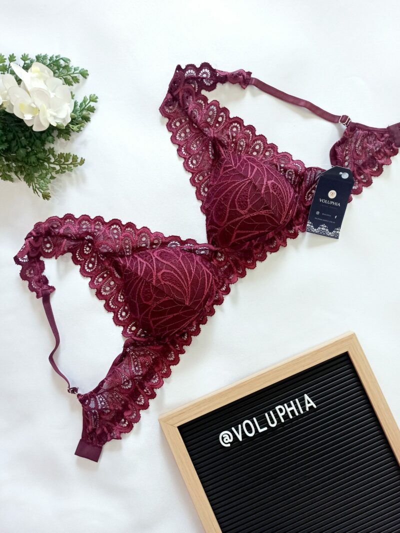 Top vinho, com bojo, em renda, com alças reguláveis.